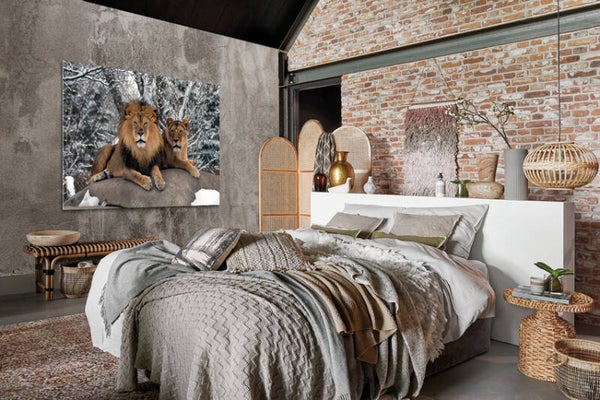 Kunststof schilderij van leeuw en leeuwin liggend op een rots in een mooi winterlandschap met zwart-witte bosrijke achtergrond.