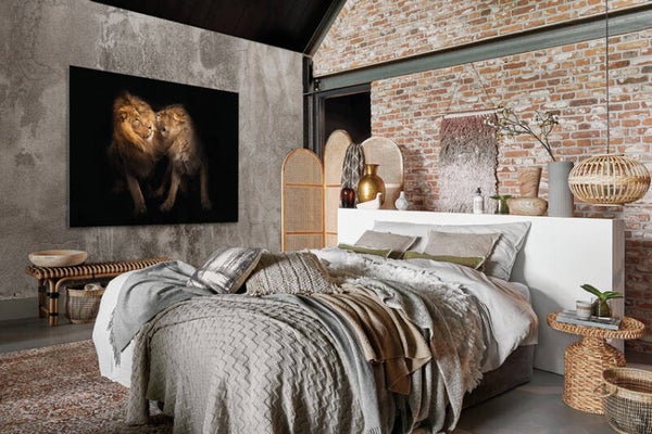 Schilderij van dibond of plexiglas met twee verliefde leeuwen op een zwarte achtergrond. Verkrijgbaar in een liggend en vierkant formaat.
