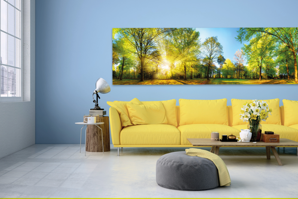 Schitterende natuuur poster met geelgroen lentelandschap en een zon die het frisse gebladerte prachtig verlicht.