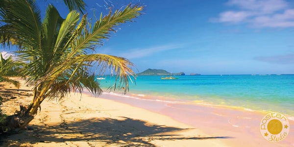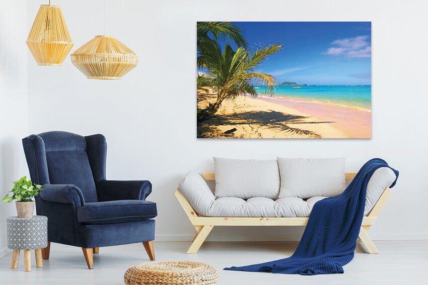 Heerlijk beeld van een zonnig strand met een helder blauwe zee. Verkrijgbaar in een liggend en panoramisch formaat.
