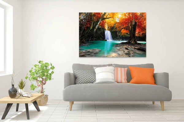Prachtige natuur poster van een natuurlijke turkoise kleurige waterval in een herfstbos.