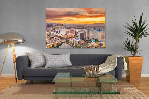 Fraaie skyline van The Strip tijdens de zonsondergang in Las Vegas, Nevada, Verenigde Staten.