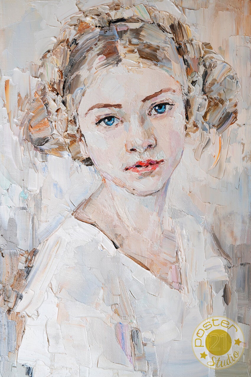 Jong meisje met mooie mysterieuze blauwe ogen op een witte achtergrond. Het origineel is geschilderd in olieverf op doek.