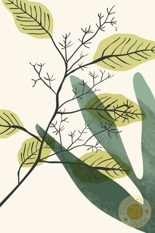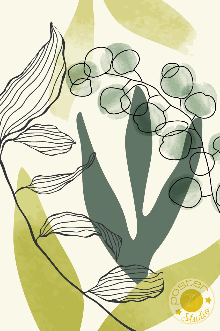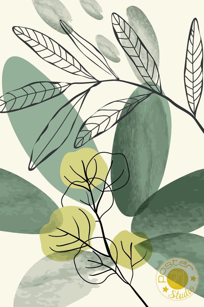 Moderne kunst poster van abstracte groengele bladeren. Set van drie kunstwerken. Echte intrigerende eye-catchers voor bijvoorbeeld in de hal of een andere kamer naar keuze.